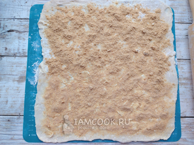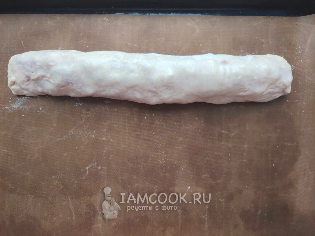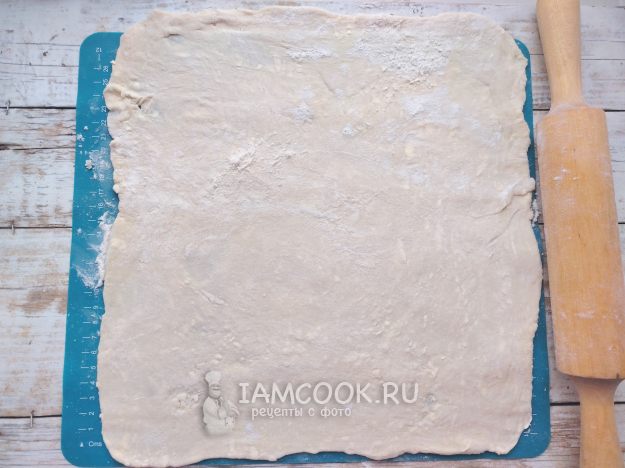 Отдохнувшее тесто на подпыленной мукой рабочей поверхности раскатать в тонкий пласт прямоугольной формы.