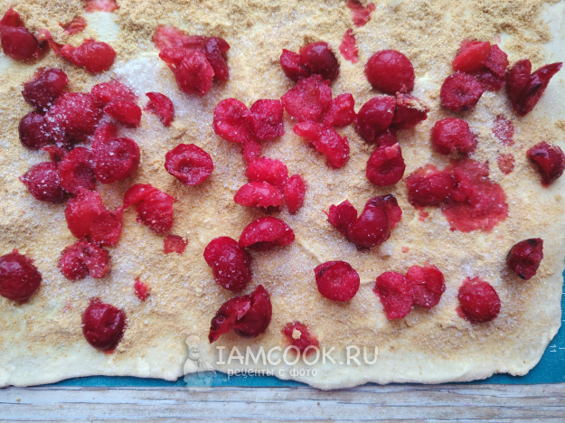 Разместить по всей поверхности равномерно вишню. Посыпать сахаром и ванилином.