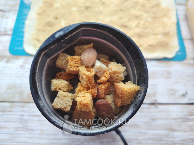 Подготовить начинку. Если вишня используется замороженная, предварительно дать ей оттаять. У ягоды удалить косточку, выделившийся сок слить. Если панировочные сухари готовятся самостоятельно в домашних условиях из сухариков в кофемолке, можно одновременно с ними измельчить в крошку орешки миндаля.