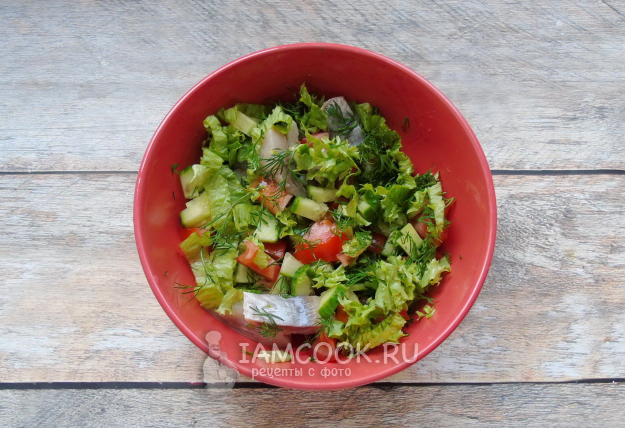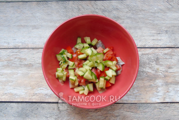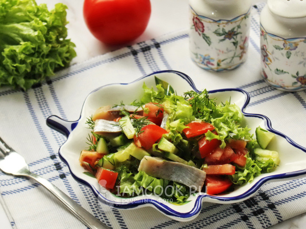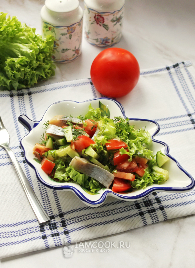 Ароматный, полезный и вкусный салат с селедкой и помидорами готов.