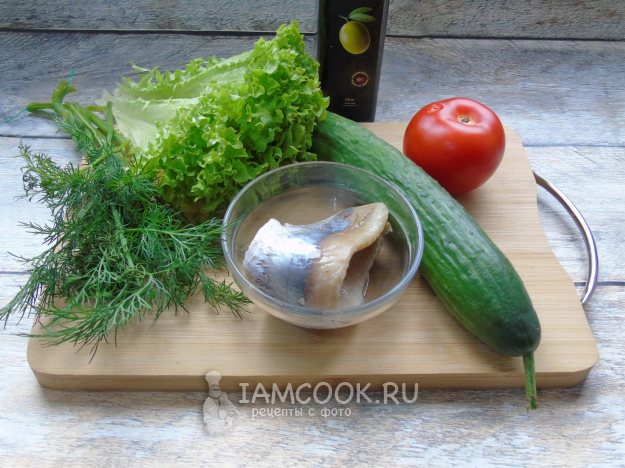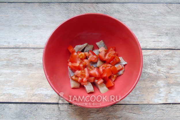 Ингредиенты для приготовления салата с селедкой и помидорами - перед вами, на фото.