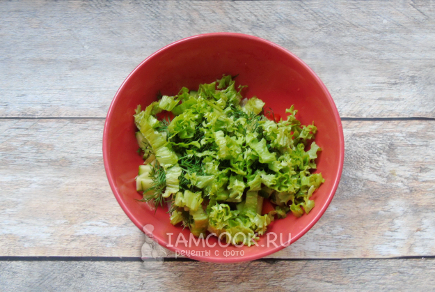 Листы салата помойте, просушите и нарежьте или порвите руками.
