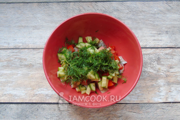 Добавьте в салат нарезанный укроп, который предварительно помойте.