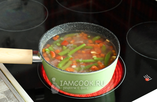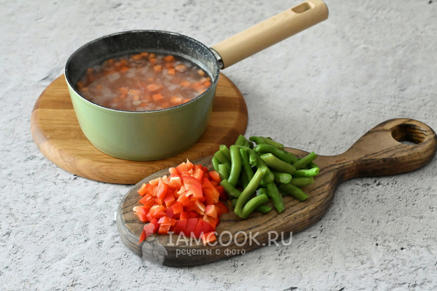 Затем в суп добавьте сладкий перец и стручковую фасоль. Они варятся быстрее остальных продуктов, поэтому добавляем их попозже.