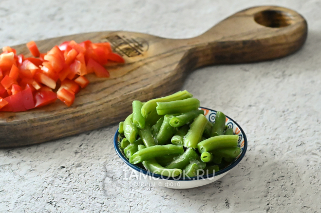 Стручковая фасоль у меня замороженная, уже нарезанная. Пока я чистила и резала другие овощи, она немного разморозилась.