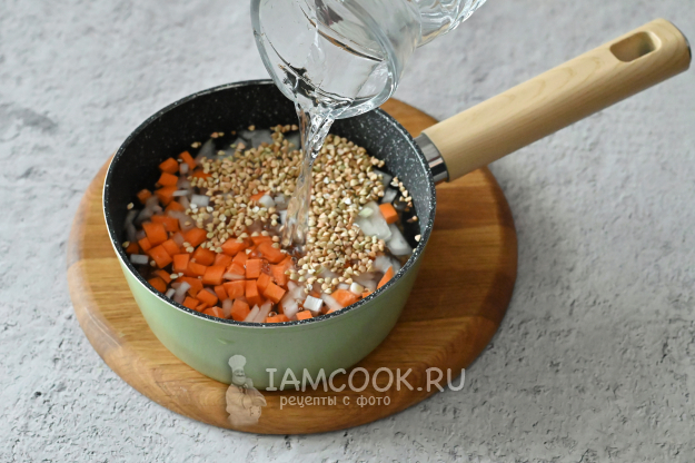 В кастрюлю положите лук и морковь, всыпьте зелёную гречку и влейте воду. Сразу посолите по вкусу.
