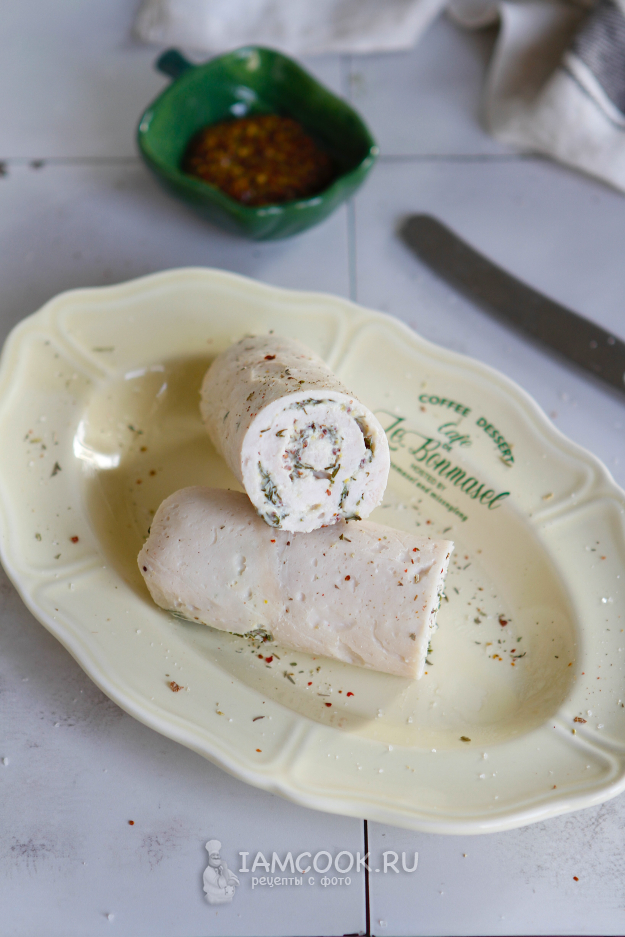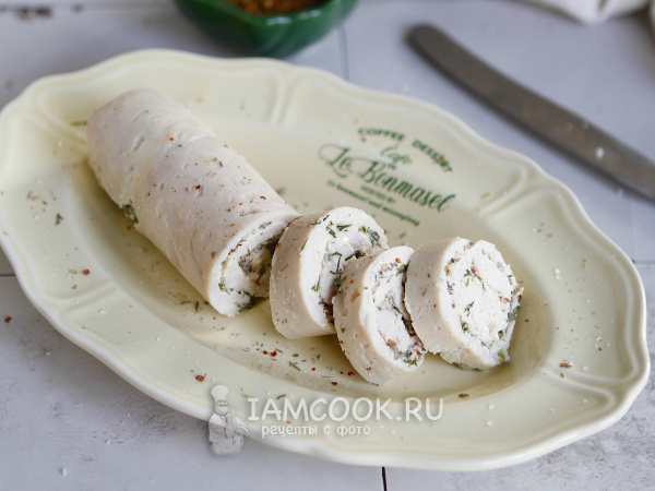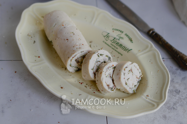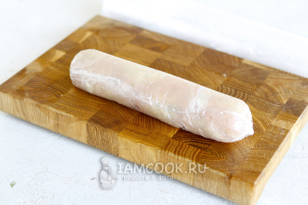 Натягивая пленку сверните грудку в рулет. Для надежности можно дополнительно обмотать рулет пищевой пленкой, закрепив края обычной ниткой.