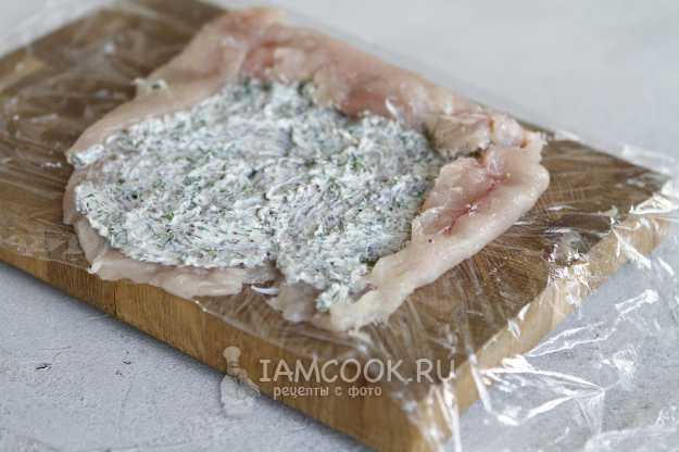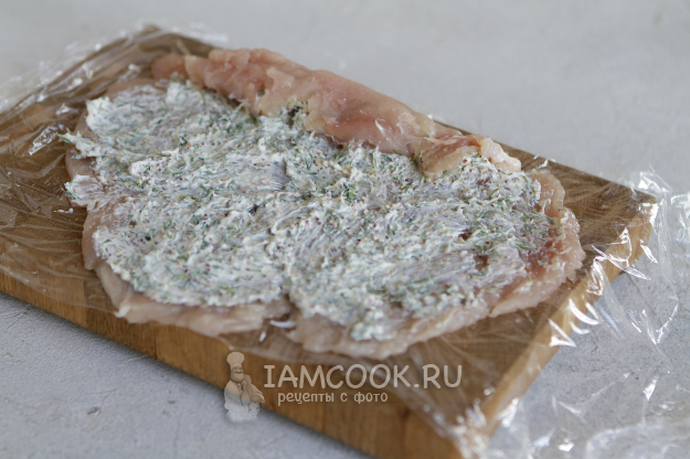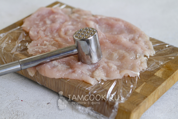 Для удобства доску застелите пищевой пленкой. На пленку выложите филе грудки и хорошо его отбейте. Толщина отбитой грудки должна быть не больше 2 мм.