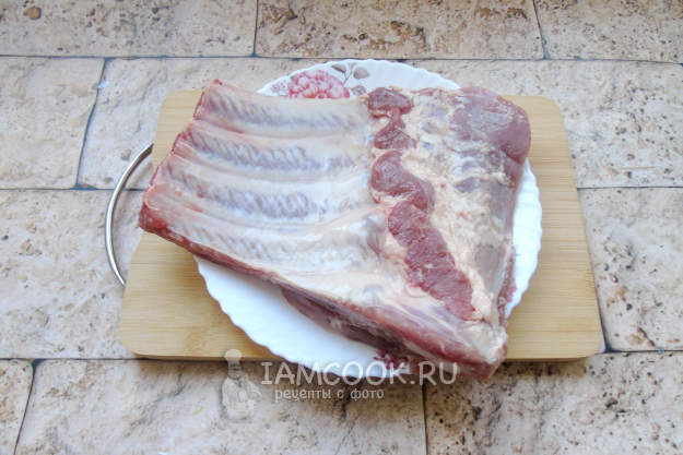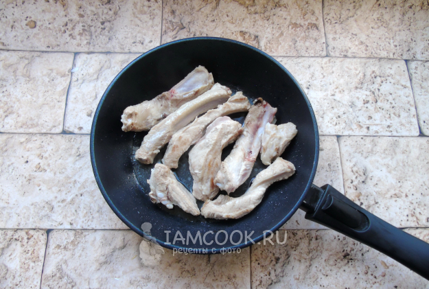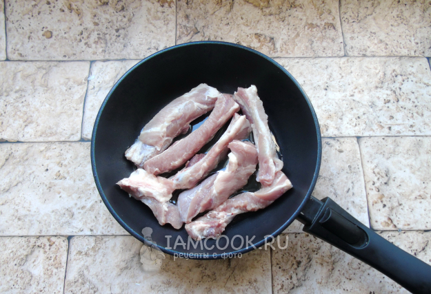 Ребра нарежьте, помойте и выложите на горячую сковороду с растительным маслом.