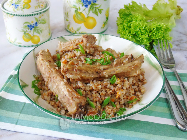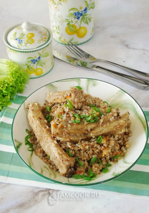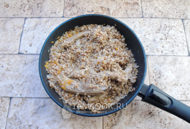 Накройте сковороду крышкой и тушите свиные ребра с гречкой до готовности.