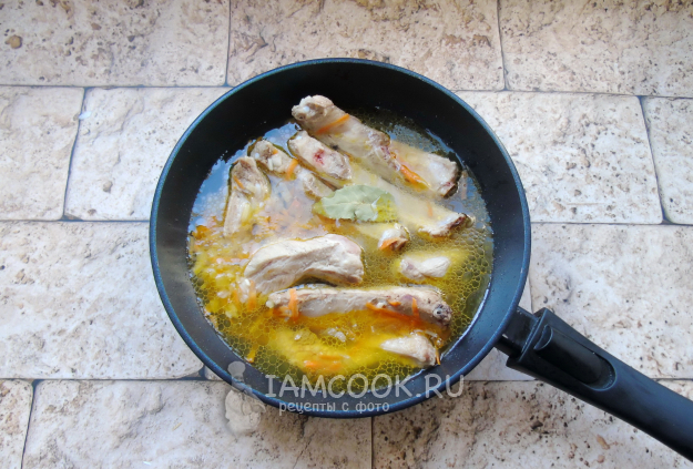 После добавьте лавровый лист и налейте воду. Немного посолите и поперчите.