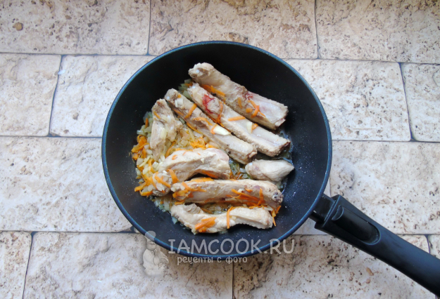 Лук мелко нарежьте, а морковь натрите на терке. Добавьте к ребрам в сковороду.