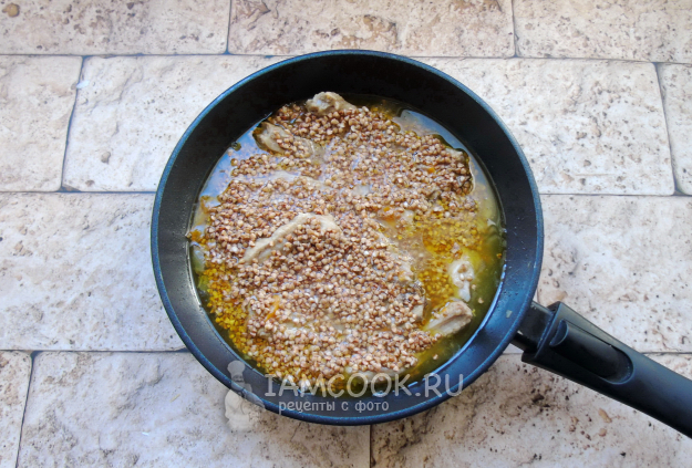 Гречку переберите и помойте. Выложите в сковороду с тушеными ребрами, посолите. Налейте воду, чтобы она покрывала крупу.