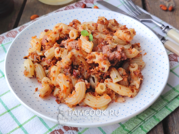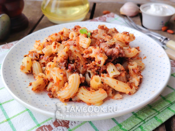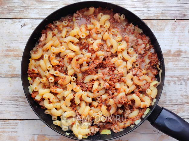 Затем добавить макароны и немного отвара из макарон. Перемешать, накрыть сковороду крышкой, подержать блюдо на медленном огне до полного выпаривания жидкости.