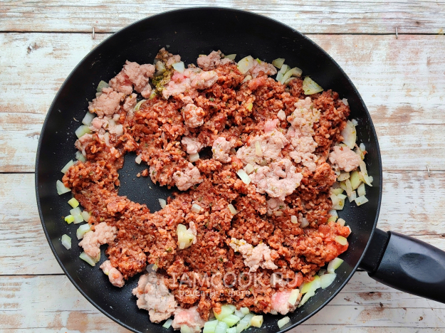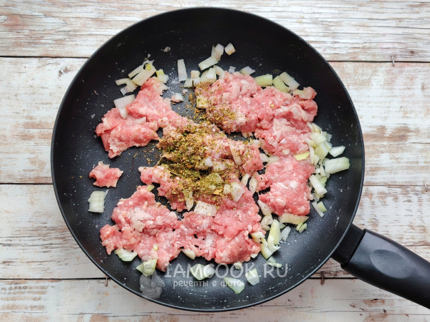 На сковороде разогреть масло. На нем обжарить фарш с луком с добавлением специй до побеления фарша.