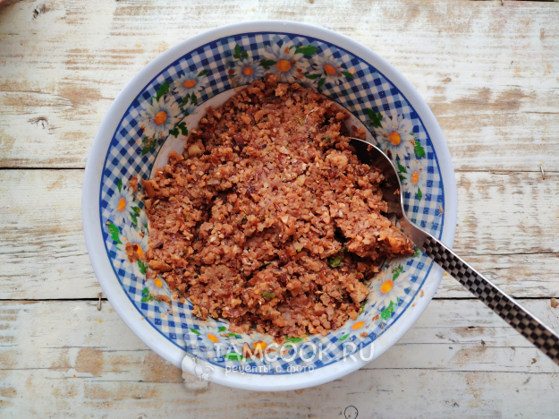 В сковороду добавить фасолевую массу. Перемешать и жарить их вместе еще около 20 минут. Если масса станет слишком сухой, можно влить немного воды.