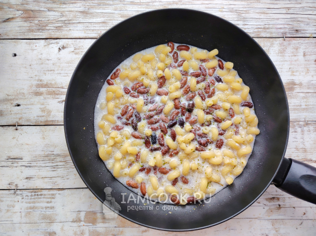 К макаронам отправить фасоль, сметану, специи. Влить немного воды, если содержимое слишком сухое. Потушить немного.