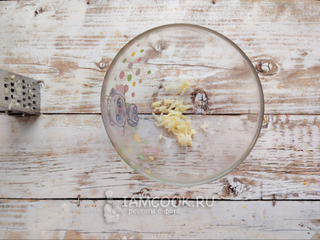 Чеснок пропустить через пресс или натереть на терке с мелкой ячейкой.