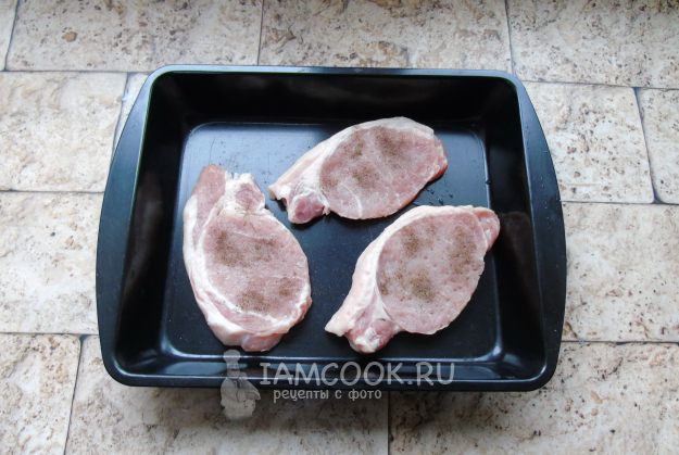 Свинину помойте, высушите бумажными салфетками. Нарежьте поперек волокон толщиной 1,5-2 сантиметра. Немного отбейте и выложите в форму для запекания. Посолите и поперчите.