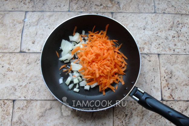 Лук и морковь очистите, помойте. Лук мелко нарежьте, а морковь натрите на терке. Налейте в сковороду растительное масло.