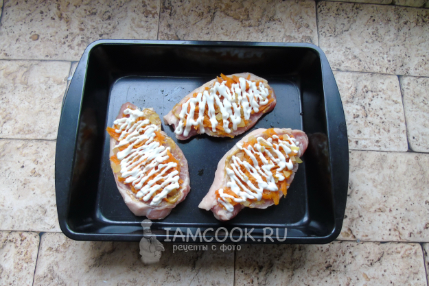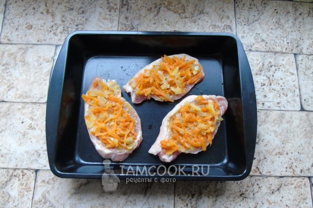 После разложите морковь с луком на ломтики свинины.