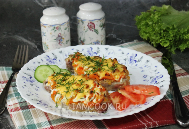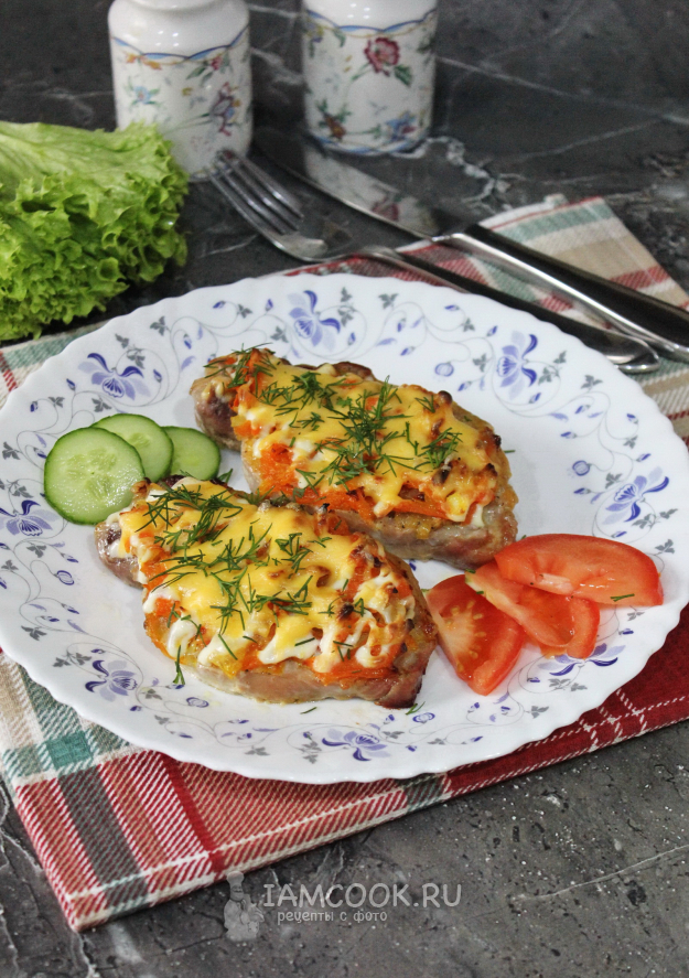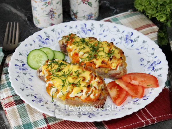 Сочная и вкусная запеченная свинина с морковью и луком готова. Подавайте со свежими овощами.