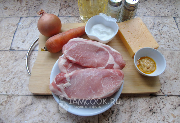 Соберите ингредиенты для приготовления свинины в духовке с морковью и луком.