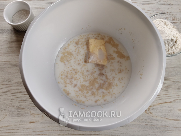 Молоко с маслом подогреть. Добавить масло и сахар.
