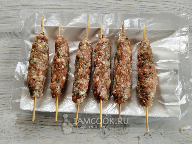 Сформировать кебабы на деревянных шпажках (их надо заранее подержать в воде) или можно без них.