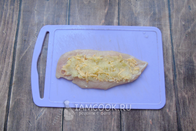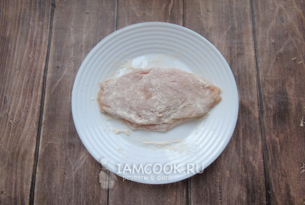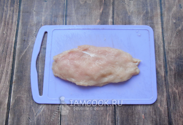 Куриное филе помойте, нарежьте вдоль на пластины. Немного отбейте, посолите и поперчите.