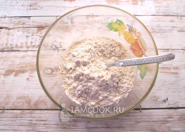 Всыпать просеянную муку. Тесто легче замешивать, если добавлять сухую смесь частями, каждый раз ложкой или миксером промешивая массу.