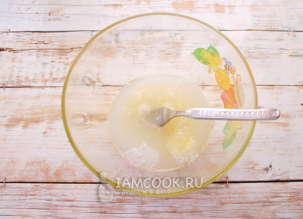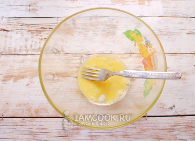 Для приготовления теста в миску вбить яйцо, разболтать его с солью венчиком или вилкой, чтобы сыпучие компоненты полностью растворились в смеси, а белок разошелся.