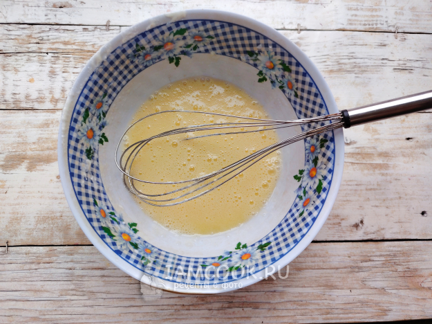 В миску вбить яйцо, добавить соль, размешать смесь до однородности.
