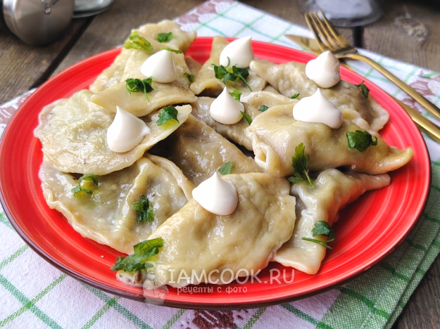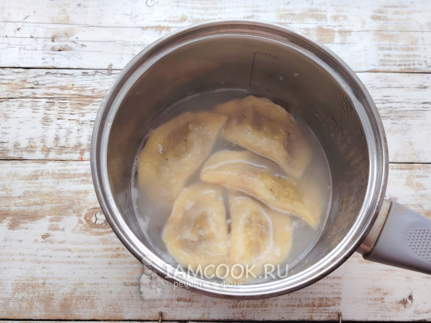 Отварить вареники с квашеной капустой и грибами в подсоленной воде в течение 5-6 минут. Вынуть их шумовкой из отвара, когда они всплывут на его поверхность.