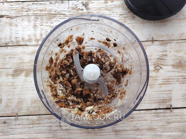 Грибы также прокрутить в чаше блендера, лук мелко порубить или измельчить аналогичным способом.
