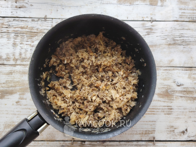 Обжарить содержимое сковороды на среднем огне до готовности грибов.