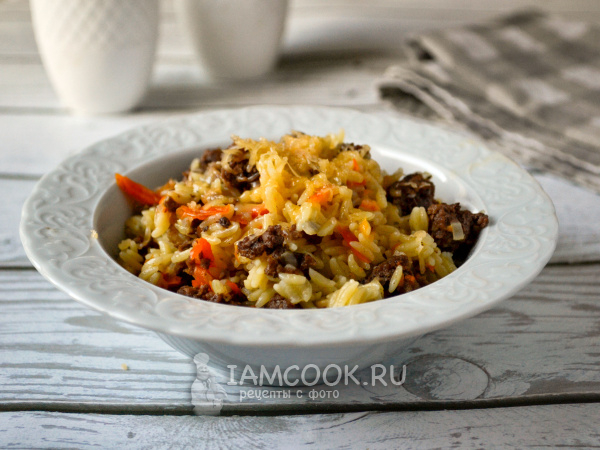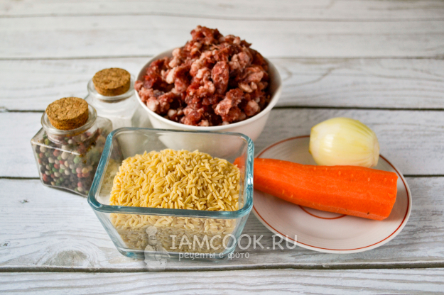 Соберите по списку продукты для приготовления пасты орзо с фаршем на сковороде. Морковь и лук почистите.