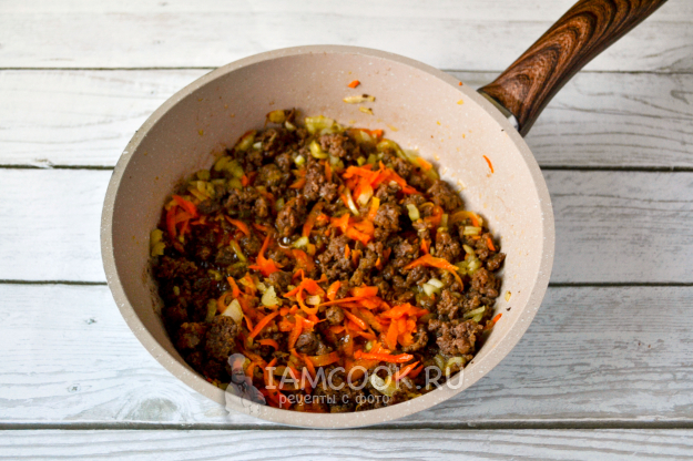 Разогрейте сковороду с растительным маслом, положите мясной фарш.
