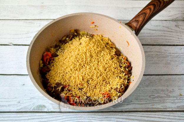 Всыпьте в сковороду орзо.