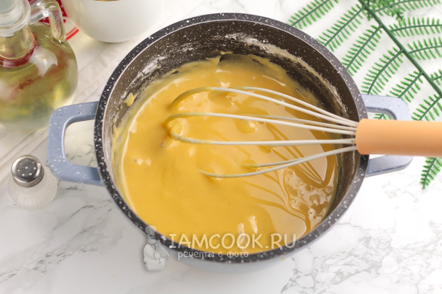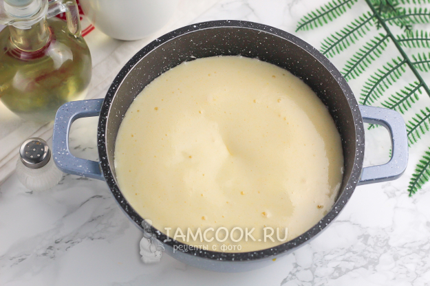 Тщательно перемешайте и томите на среднем нагреве до появления пузырей.