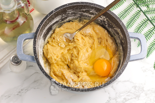 Вбейте куриное яйцо и вмешайте. Если яйца мелкие, то вмешайте два яйца. Добавьте остаток муки и замесите плотное тесто.