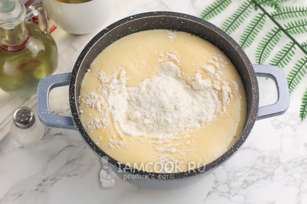 Всыпьте половину муки и вмешайте ее в массу.