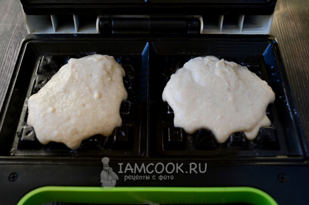 Разогрейте электрическую вафельницу. При необходимости смажьте панели растительным маслом и положите по полной столовой ложке теста на одну вафлю. Выпекайте вафли из нутовой муки в вафельнице до румяности, примерно 5 минут. Но в любом случае ориентируйтесь на готовность вафель, так как вафельницы у всех разные.