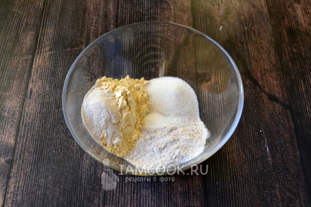 В миску насыпьте нутовую муку, муку из зеленой гречки, псиллиум, сахар, разрыхлитель и щепотку соли. Перемешайте.