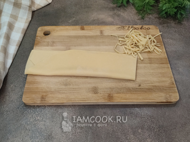 Припылите поверхность пласта мукой, сверните подобием рулета, нарежьте лапшу.