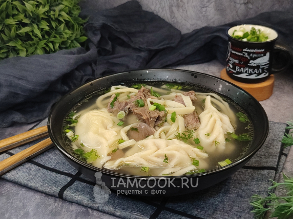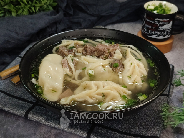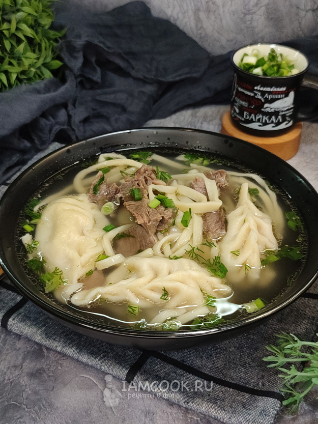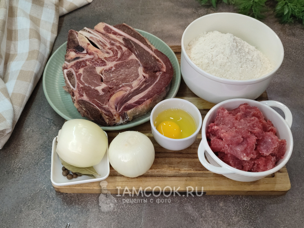 Соберите ингредиенты для приготовления бурятского супа баншатай (баншатай шулэн). Для бульона я взяла говядину на кости, с жирком, лопатку (покупала, кстати, в бурятском магазине 😉), иногда готовят такой суп с бараниной, иногда используют и говядину, и баранину одновременно. Фарш у меня смешанный, свинина с говядиной.