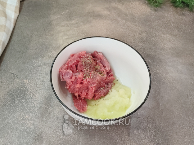 А мы тем временем займемся лапшой и пельменями. Для пельменей к фаршу добавьте луковицу, натертую на мелкой терке (или измельченную блендером). Получится луковая кашица, сок которой придаст сочности, подмаринует нам фарш, и в отличие от лука, нарезанного ножом на кубики, протертый точно успеет приготовиться и не будет хрустеть на зубах. Добавьте соль, перец.