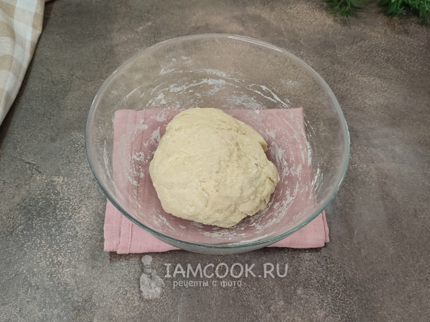 Затем, постепенно подсыпая по необходимости оставшуюся муку, руками замесите плотное, упругое, не липнущее к рукам тесто. Накройте тесто пленкой, оставьте отдохнуть минут на 20.