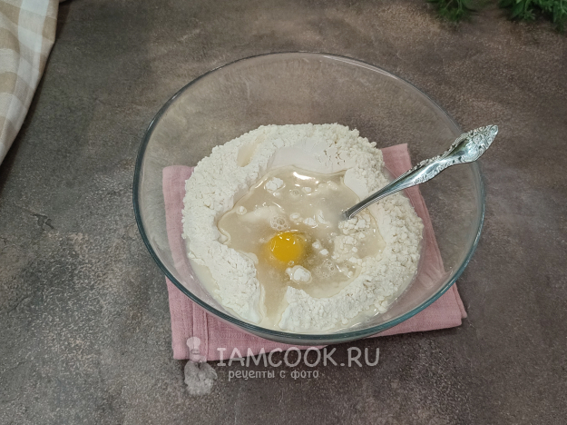 Тесто целесообразно готовить одно и для лапши, и для пельменей. В миску всыпьте муку, не всю сразу, примерно 2/3. Влейте воду, добавьте яйцо, соль.
