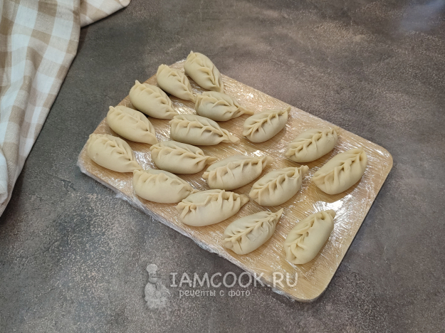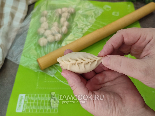 Выкладываем подготовленный фарш в середину заготовки, защипываем края. Чаще всего у банши лепка косичкой, но если вы сформуете пельмени, как в русской кухне, вкус у них от этого не изменится 😉.